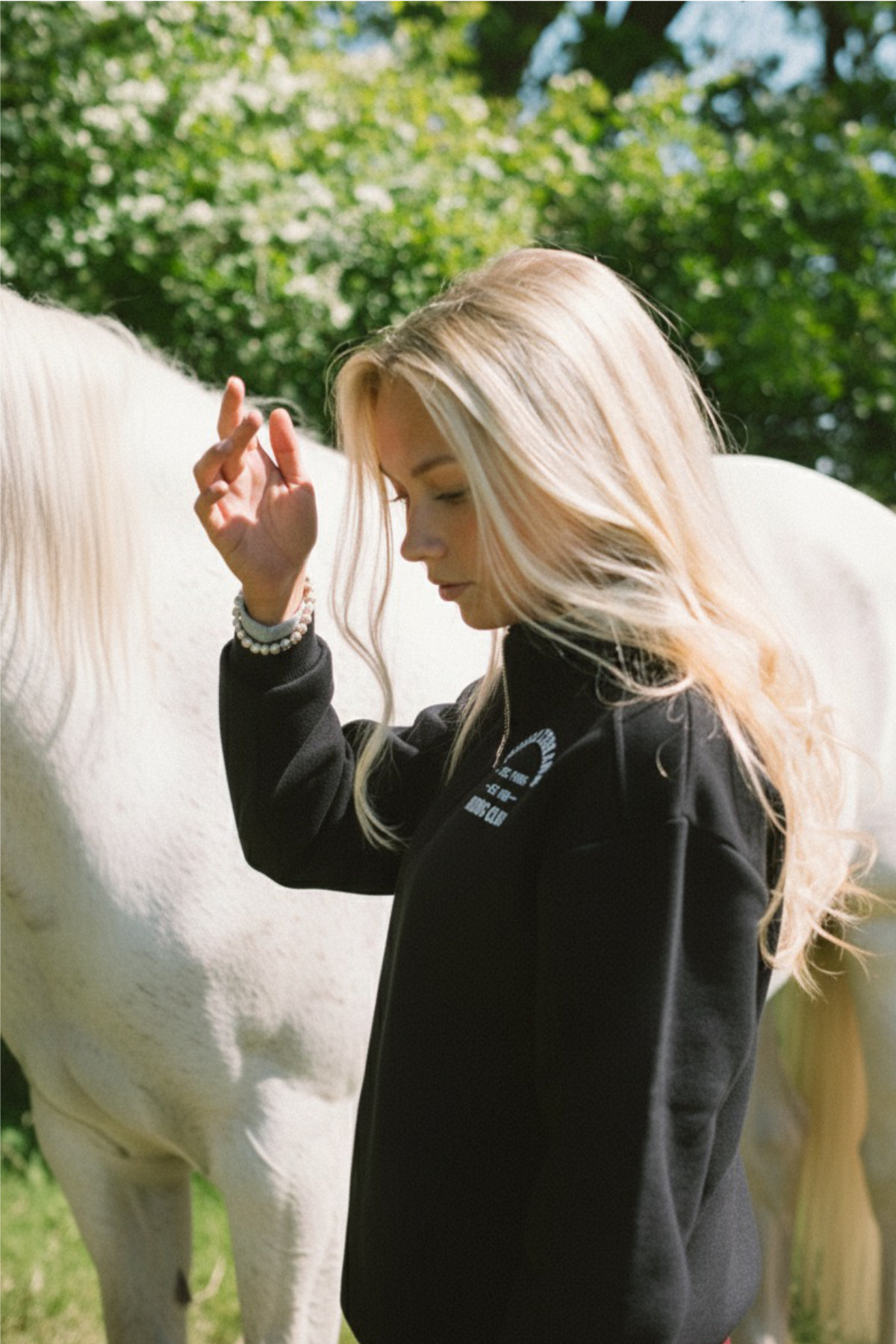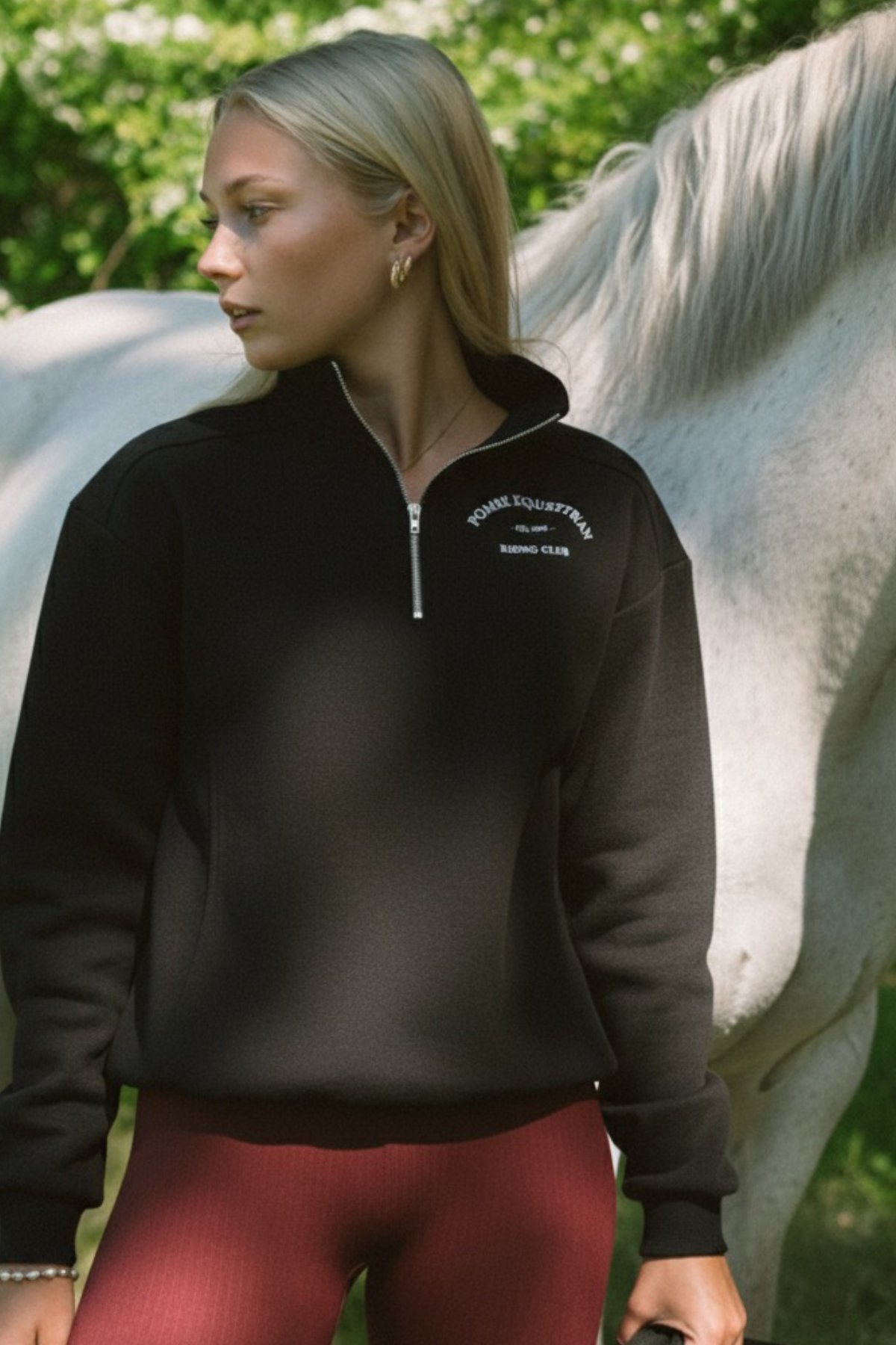 The perfect addition to your equestrian wardrobe: Pomme Club Crewneck with half zipper. Crafted for comfort and practicality, this crewneck is a cozy essential for riders.
